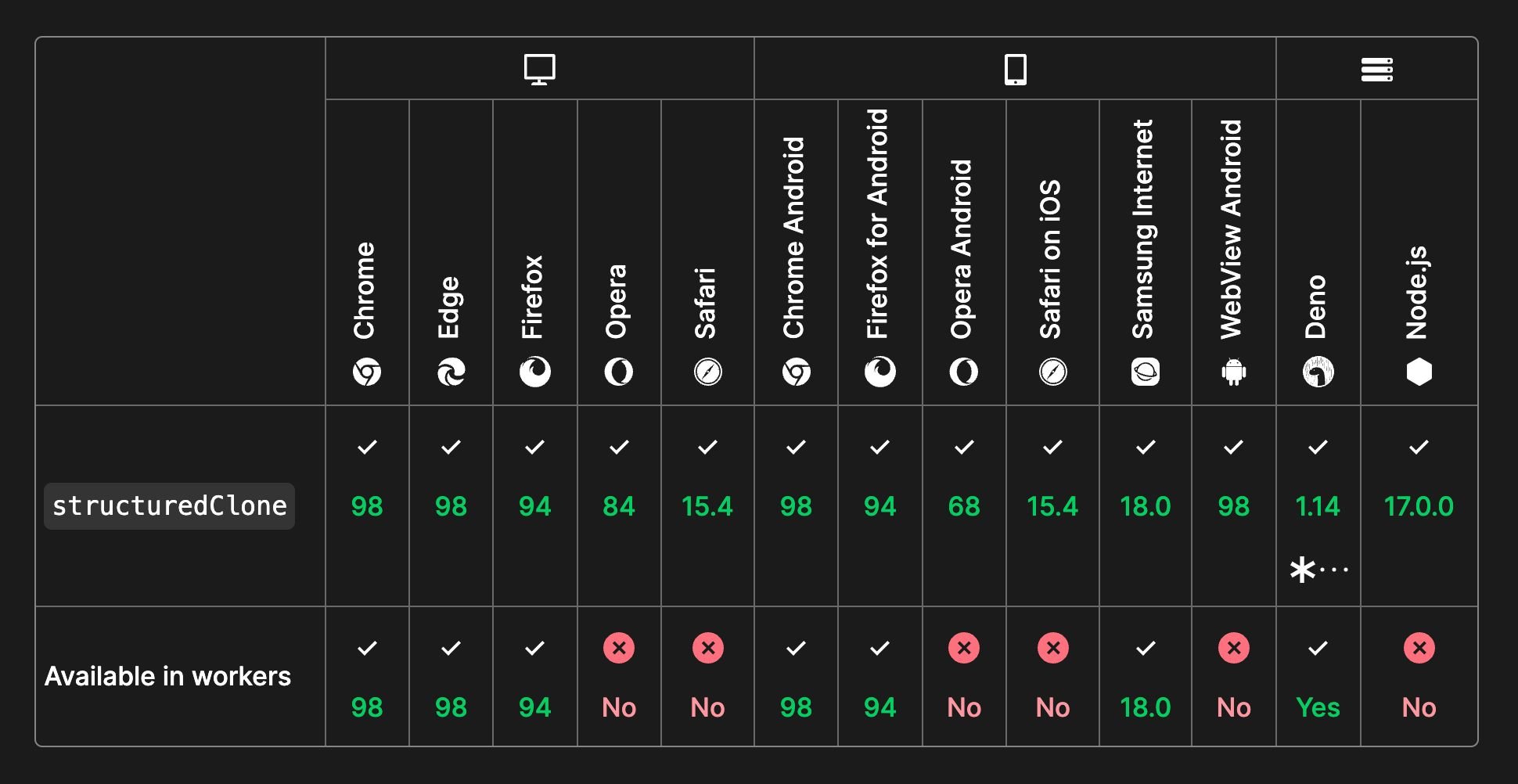 这是最好的部分 - 所有主流浏览器都支持 structuredClone ,甚至 Node.js 和 Deno。